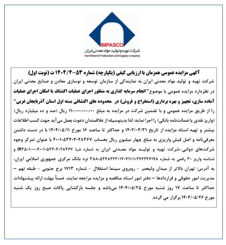 شرکت تهیه و تولید مواد معدنی ایران به نمایندگی از سازمان توسعه و نوسازی معادن و صنایع معدنی ایران در نظردارد مزایده عمومی با موضوع”انجام سرمایه گذاری به منظور اجرای عملیات اکتشاف با امکان اجرای عملیات آماده سازی، تجهیز و بهره برداری (استخراج و فروش) در محدوده های اکتشافی بسته اول استان آذربایجان غربی” را از طریق مزایده عمومی و با تضمین شرکت در مزایده به مبلغ ۱۱۰٫۰۰۰٫۰۰۰٫۰۰۰ ریال (صد و ده میلیارد ریال) (واریز نقدی یا ضمانت‌نامه بانکی) را اجرا نماید؛ لذا بدینوسیله از علاقمندان دعوت بعمل می‌آید جهت کسب اطلاعات بیشتر و تهیه اسناد مزایده از تاریخ ۱۴۰۴/۰۴/۳۱ و حداکثر تا ساعت ۱۶ مورخ ۱۴۰۴/۰۵/۱۱ با در دست داشتن معرفی‌نامه و اصل فیش واریزی به مبلغ چهار میلیون ریال بحساب ۴۰۰۱۰۵۳۴۰۴۰۲۸۳۶۷ با عنوان تمرکز وجوه شرکت‌های دولتی-شرکت تهیه و تولیـد مواد معـدنی ایران به شماره شبا ۳۵۰۱۰۰۰۰۴۰۰۱۰۵۳۴۰۴۰۲۸۳۶۷IR و شناسه واریز ۳۰ رقمی به شماره ۳۸۸۰۵۳۴۸۲۲۳۰۱۷۰۷۱۱۰۱۰۲۷۶۲۴۷۱۹۸ نزد بانک مرکزی جمهوری اسلامی ایران، به آدرس: تهران بالاتر از میدان ولیعصر – روبروی سینما استقلال – شماره ۱۷۱۳ برج جنوبی – طبقه نهم – مدیریت امور حقوقی و قراردادها – دفتر امور اسناد مناقصه و مزایده مراجعه نمایند. ضمناً مهلت ارائه پیشنهادات حداکثر تا ساعت ۱۷ روز شنبه مورخ ۱۴۰۴/۰۵/۲۵ می‌باشد و جلسه بازگشایی پاکات صبح روز یک شنبه مورخ ۱۴۰۴/۰۵/۲۶ برگزار می گردد.